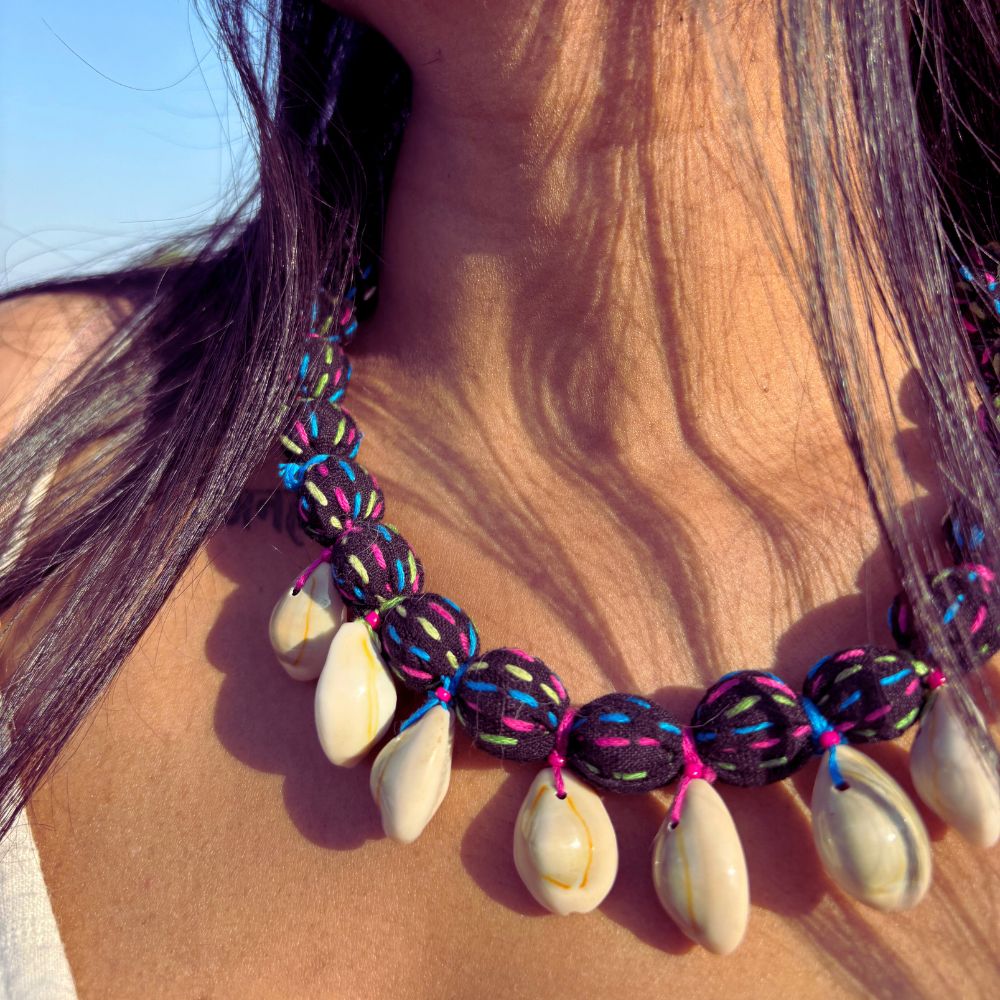 Up-cycled textile necklaces crafted by hand, celebrating sustainability, slow fashion