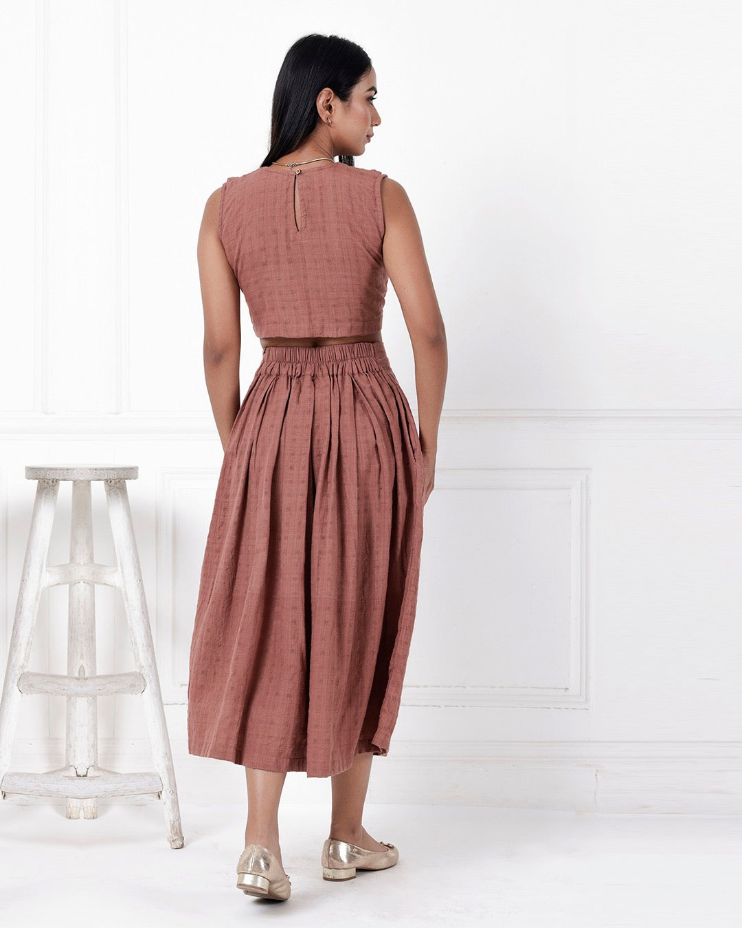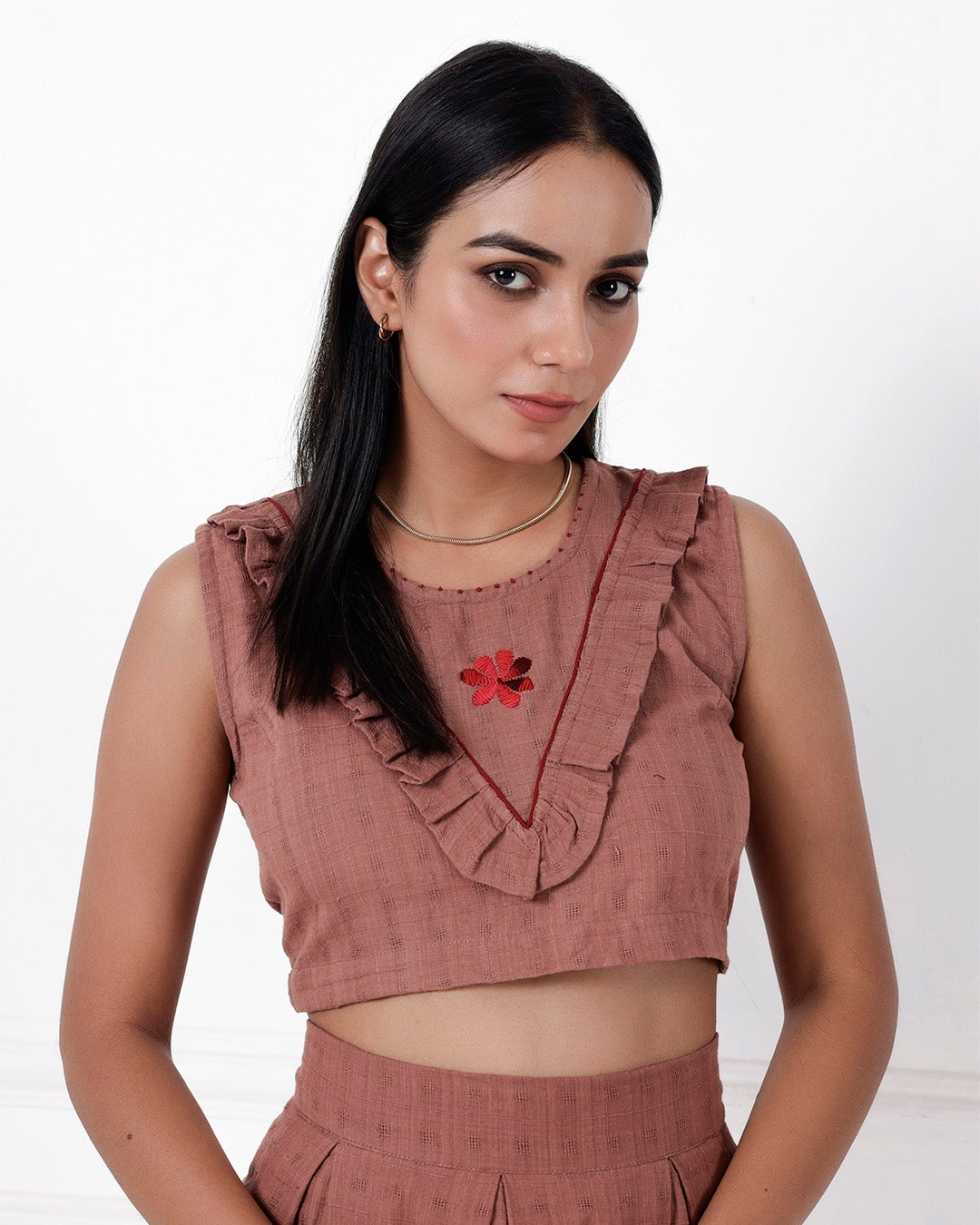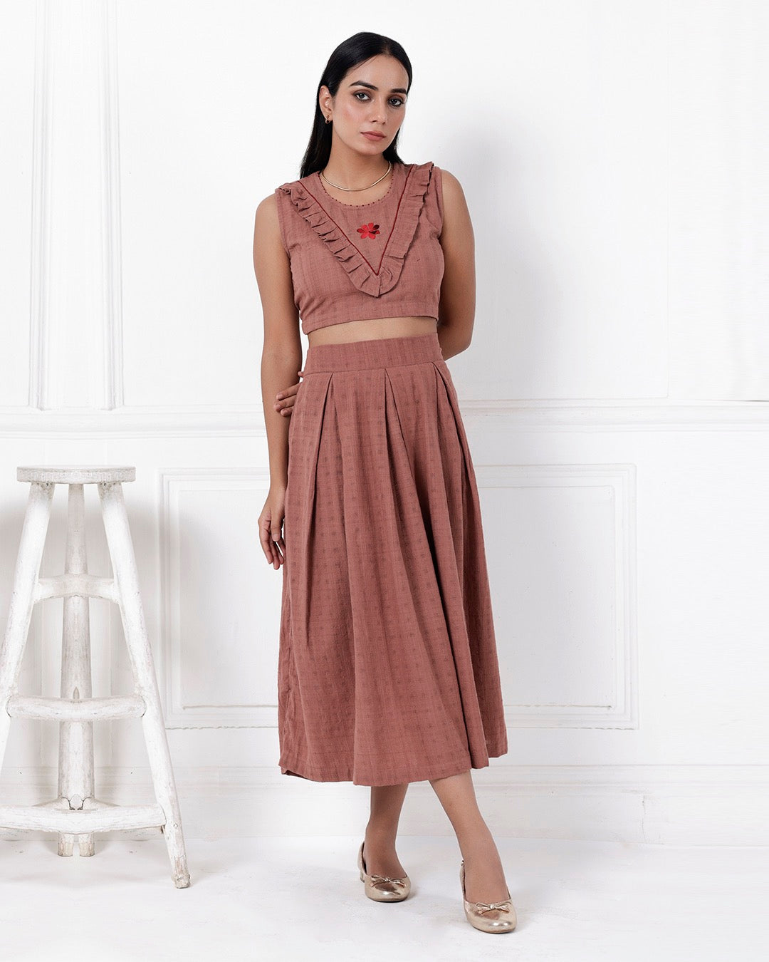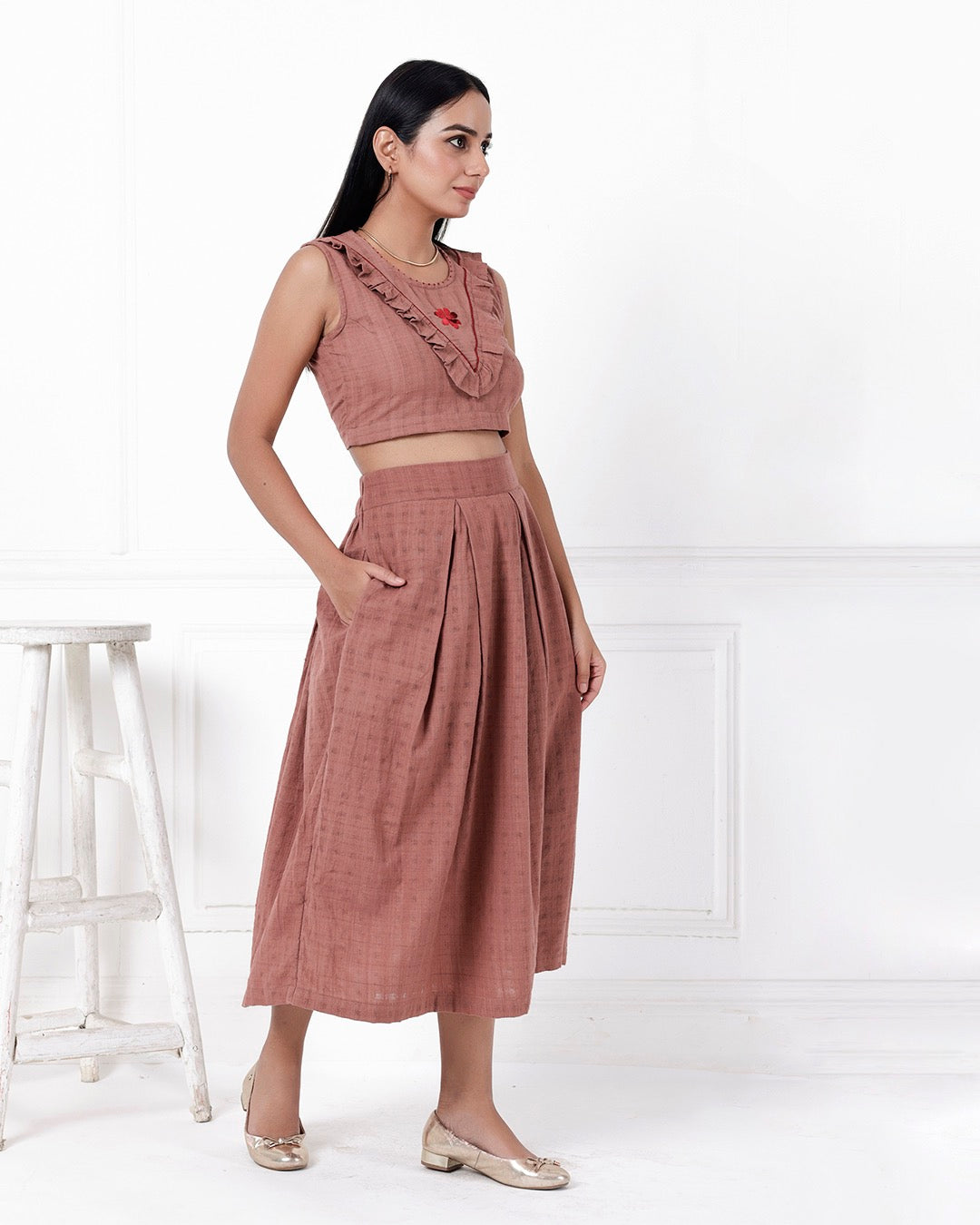 Fun & Frilled skirt set to enhance all your feminine energy that is subtle, aesthetically entuned and mindful. Crafted with handwoven cotton and adorned with delicate hand embroidery.