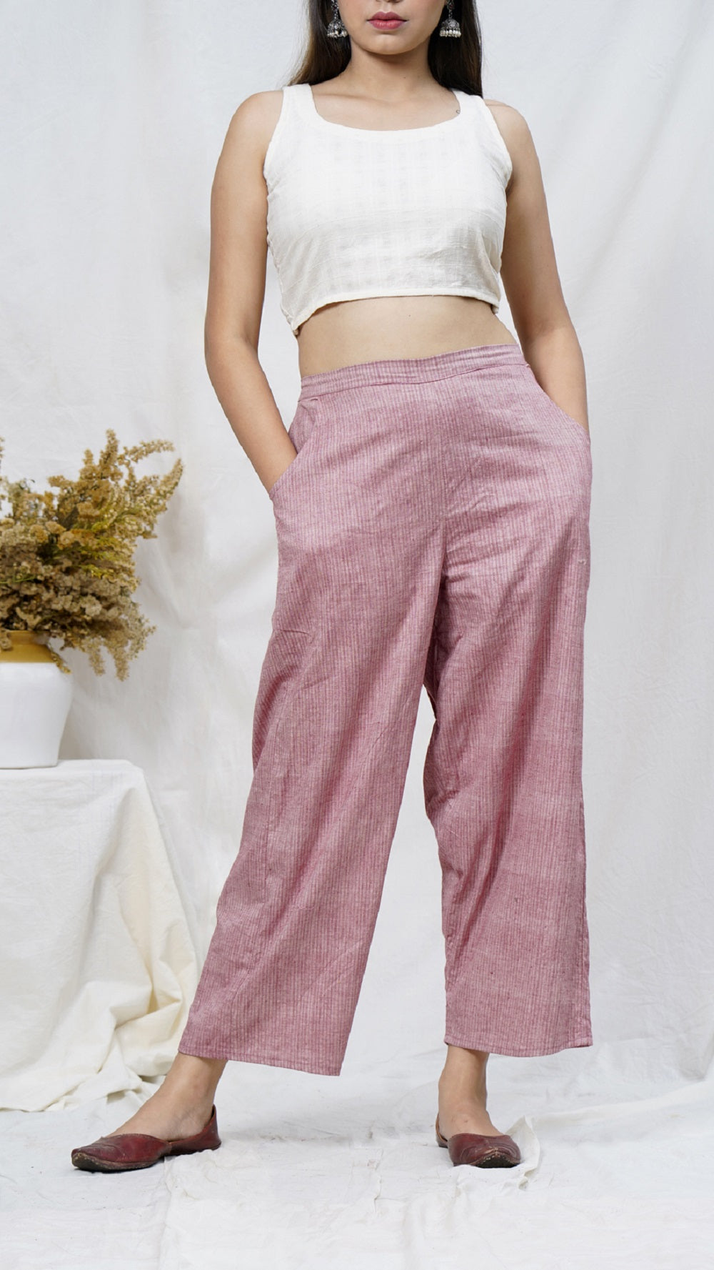 Elegant roses are handcrafted over the body of the tunic. French knot detailing on the neck and on sleeve ends. Palazzo has pockets and elasticated waist