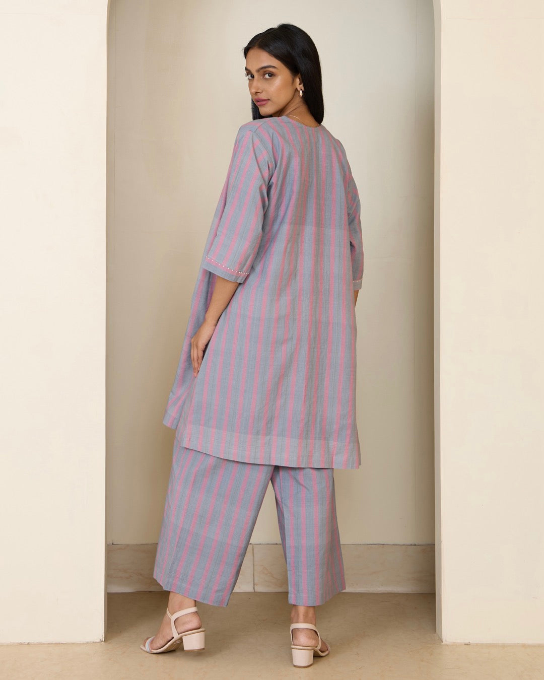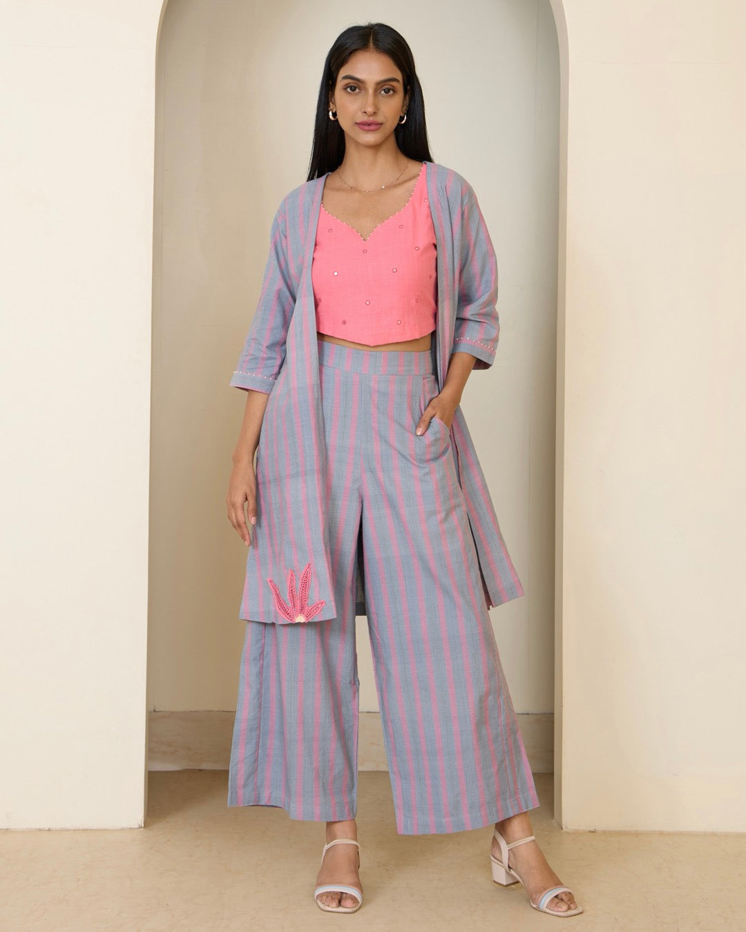 Transform your look with this refined grey striped pink three-piece ensemble featuring an overlay, palazzo, and top. The relaxed-fit overlay is adorned with floral detailing, while the palazzo offers spacious pockets and an elasticated waist. The top showcases exquisite mirror work, all this for your not-so-usual style because change looks good on you.