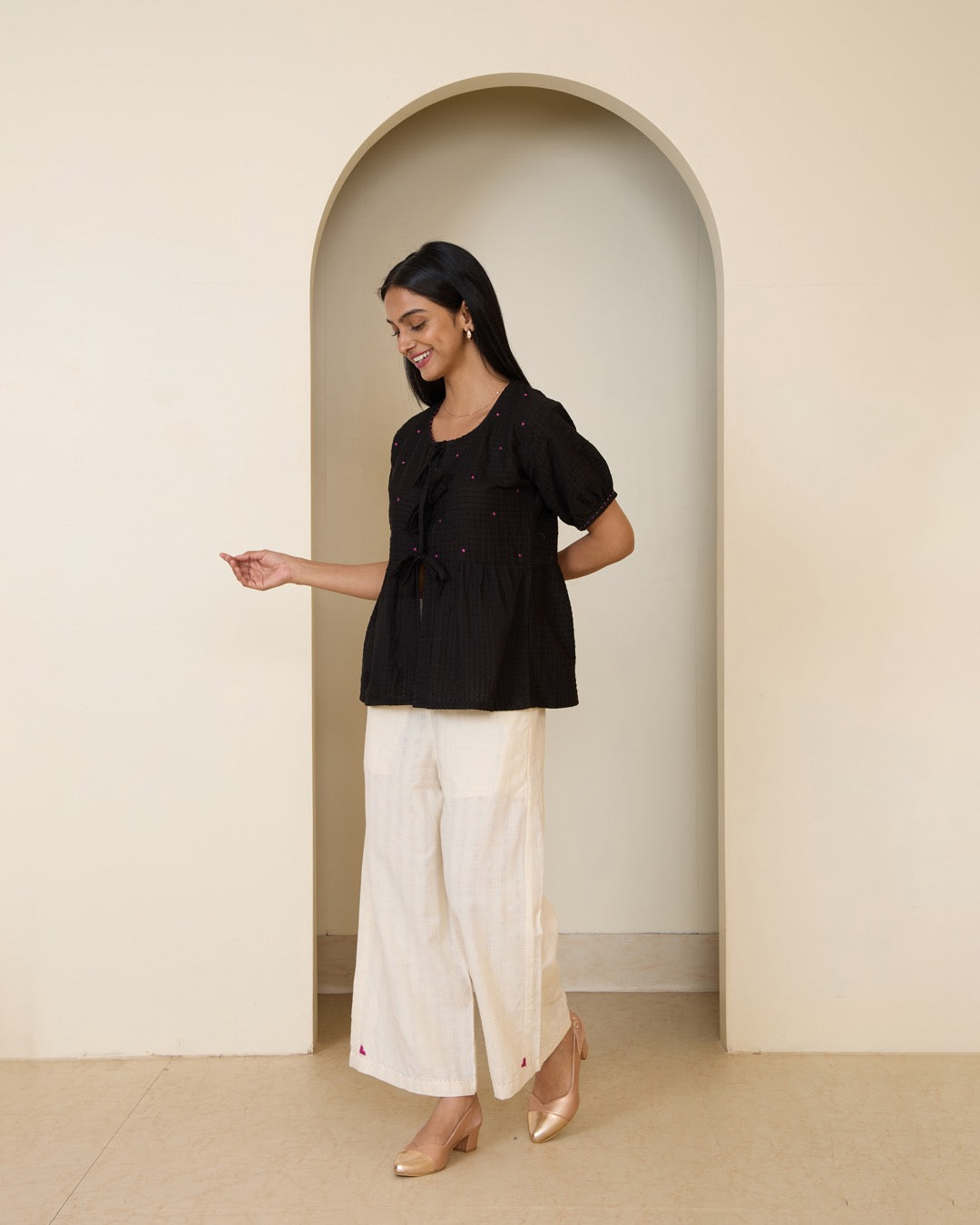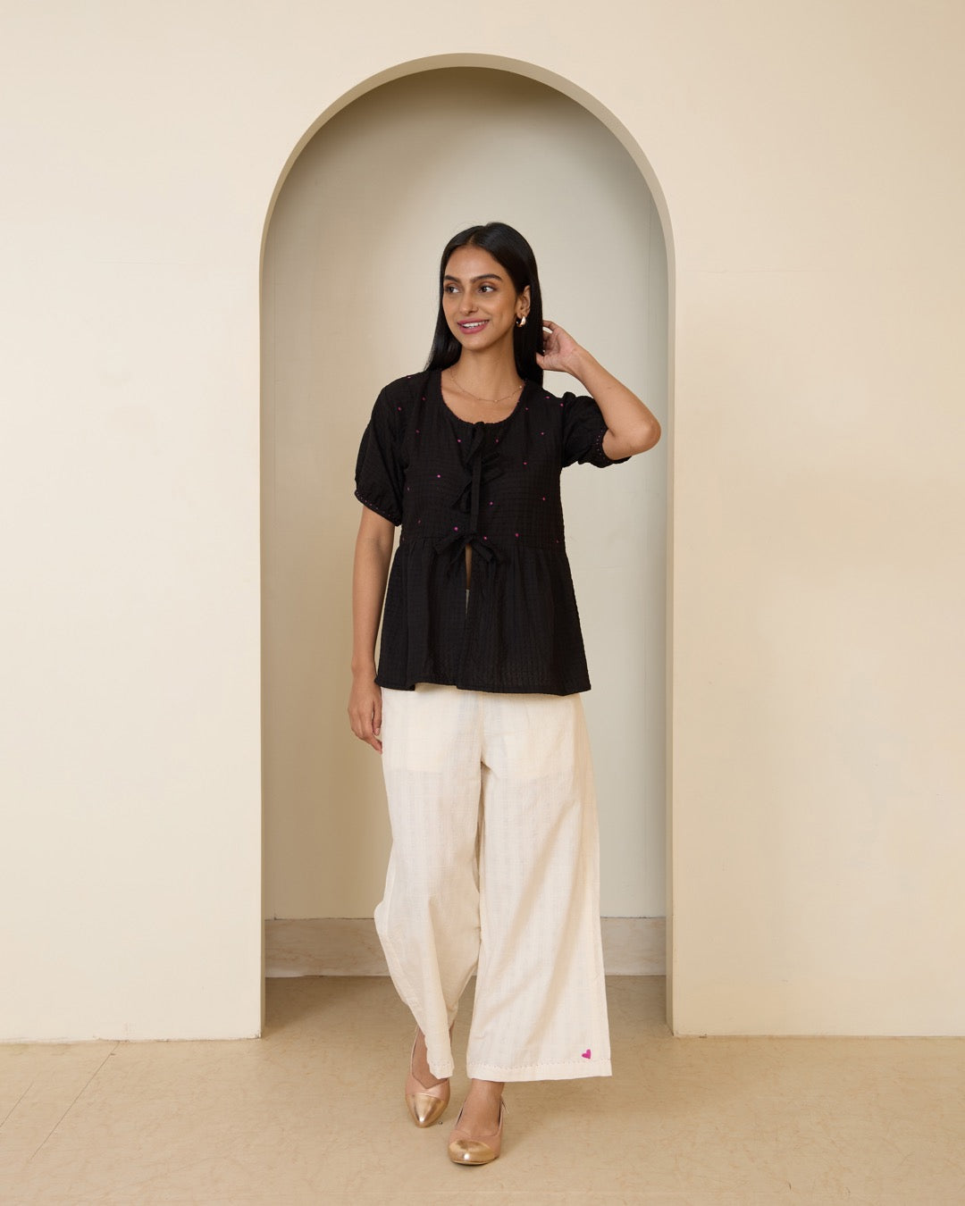 Embrace a blend of comfort and sophistication with our black top and ivory pants co-ord. Designed to suit both relaxed and semi-formal looks, this set combines timeless appeal with eco-conscious craftsmanship. With soft, breathable fabric and a streamlined silhouette, it’s an effortlessly stylish choice for any day .