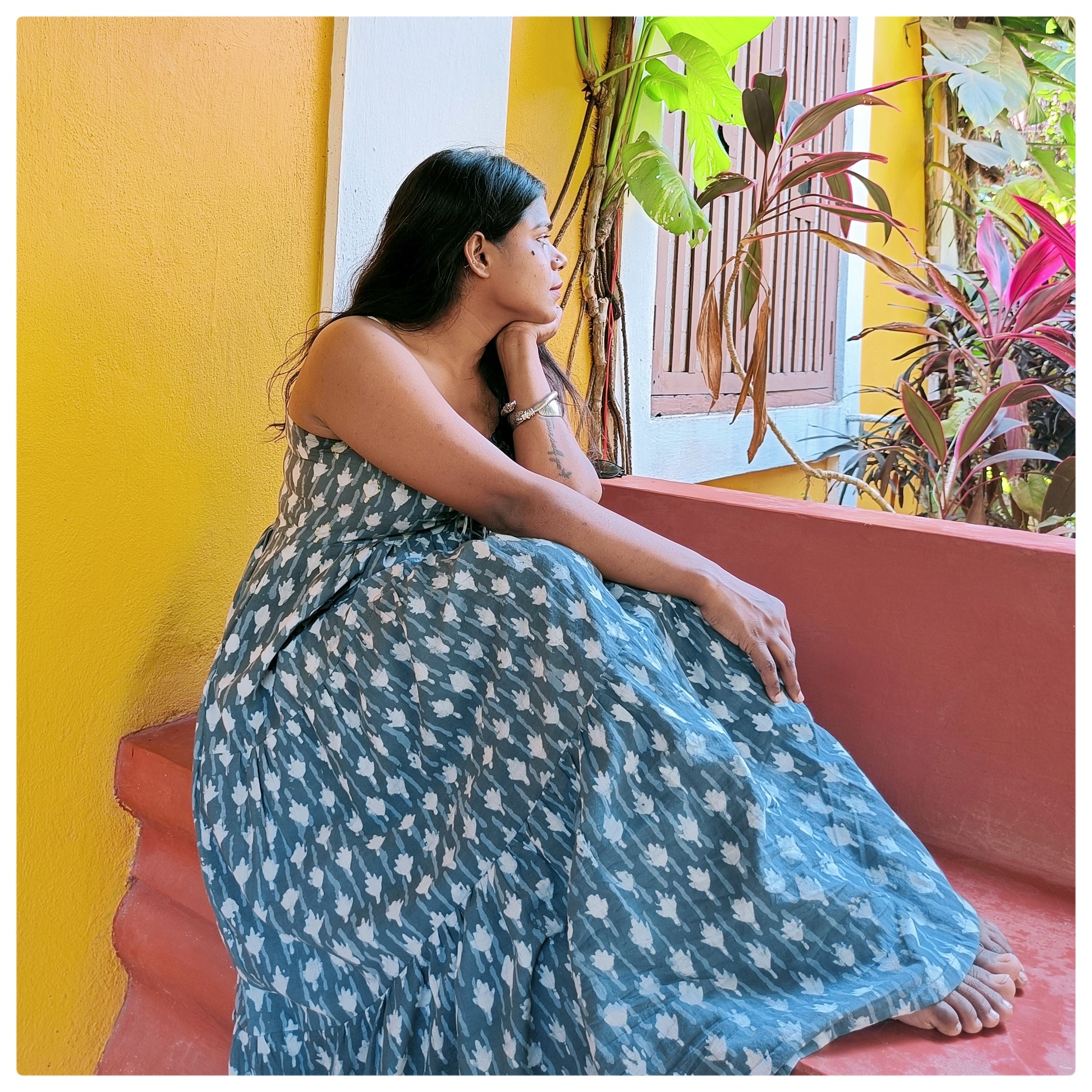 Tier dress with front pocket & flowy feel. Embellished with kantha, it smoothly transit from casualwear to occasion wear