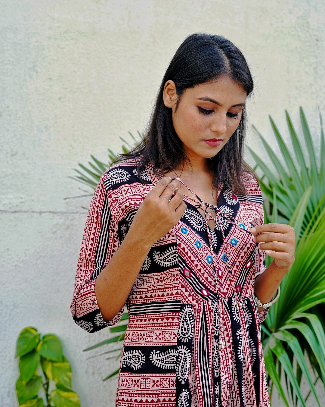 A line gathered dress with v neck & embroidered yoke. Crafted from earthy bagh print & pure cotton textile