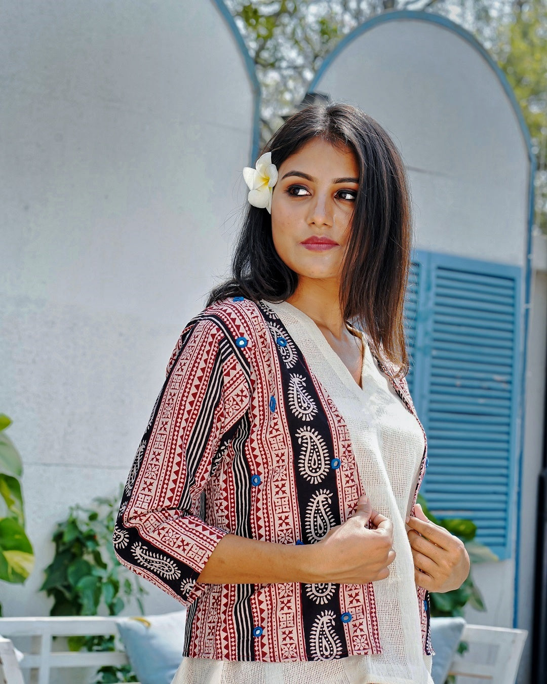 Three-piece set which brings ease to your style hustle. Made from authentically handcrafted textiles the co-ord includes hand block printed cotton jacket - bottom & kora cotton top.